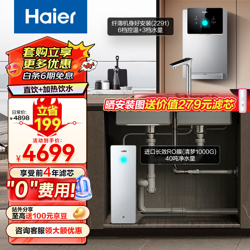 海尔(Haier)直饮加热净水器清梦1000G鲜活水pro家用反渗透厨下净水机+管线机HKC2400-R882D2U1+HGR2291-JU1价格:4699.00元!