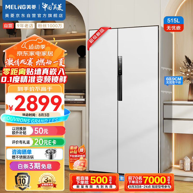 美菱(MeiLing)515升对开门双开门冰箱超薄零嵌底部散热变频一级能效节能家用风冷无霜净味BCD-515WPCZX大容量价格:3099.00元!