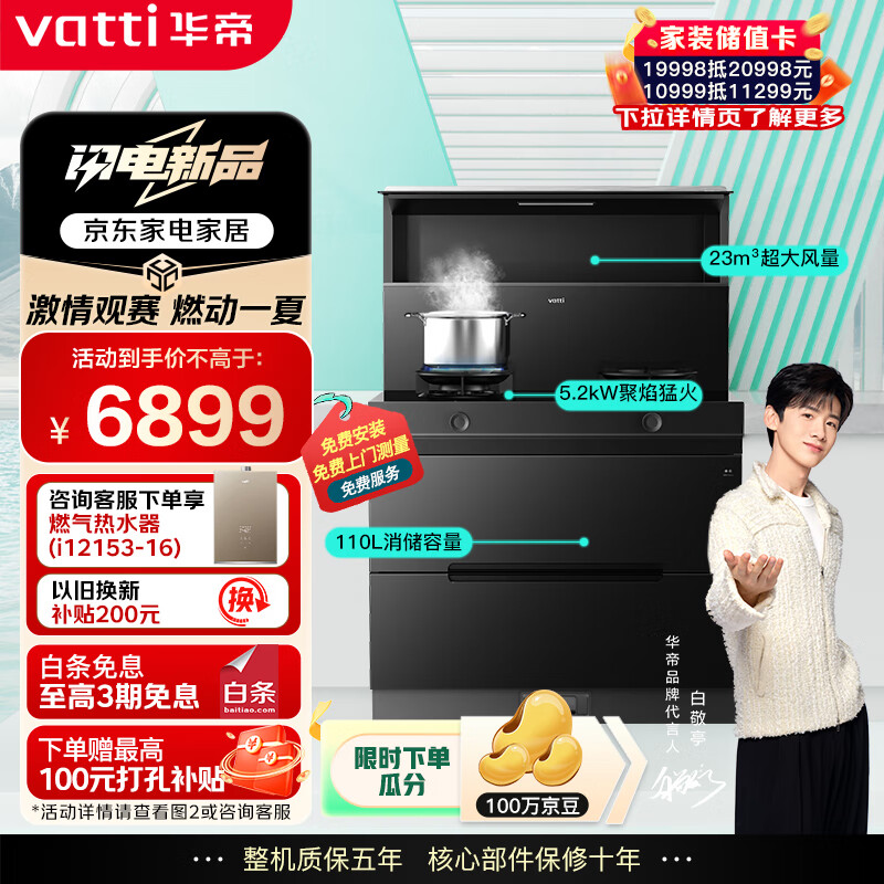 华帝 集成灶 集成一体式 消毒柜 23m3变频瞬吸 5.2kW猛火爆炒 抽烟机燃气灶套装 i30G31天然气 左烟道价格:6999.00元!