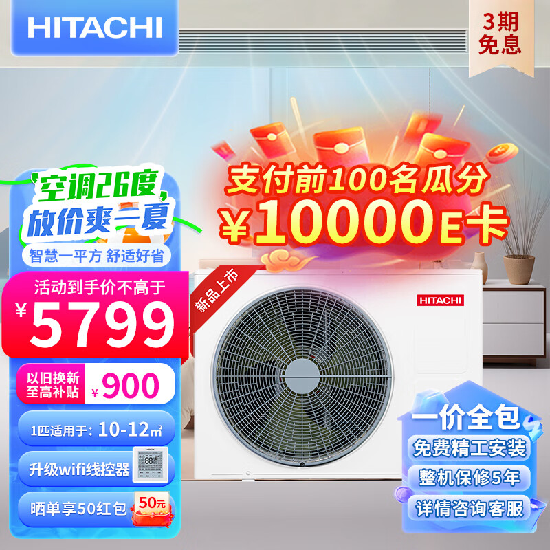 日立(HITACHI)中央空调风管机一拖一U享1匹家用嵌入式空调一价全包1级能效冷暖全直流变频价格:6399.00元!