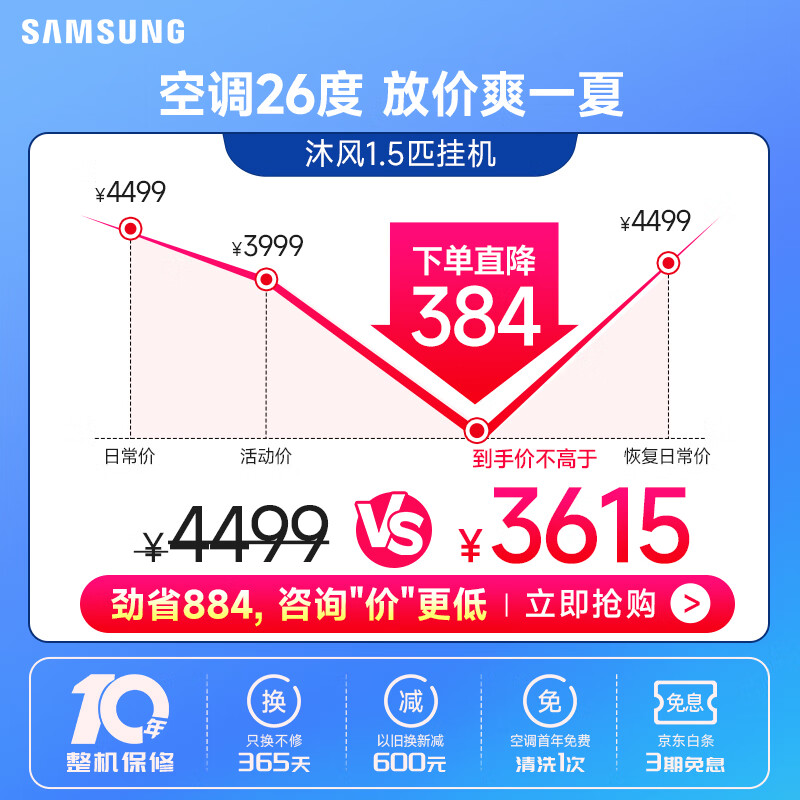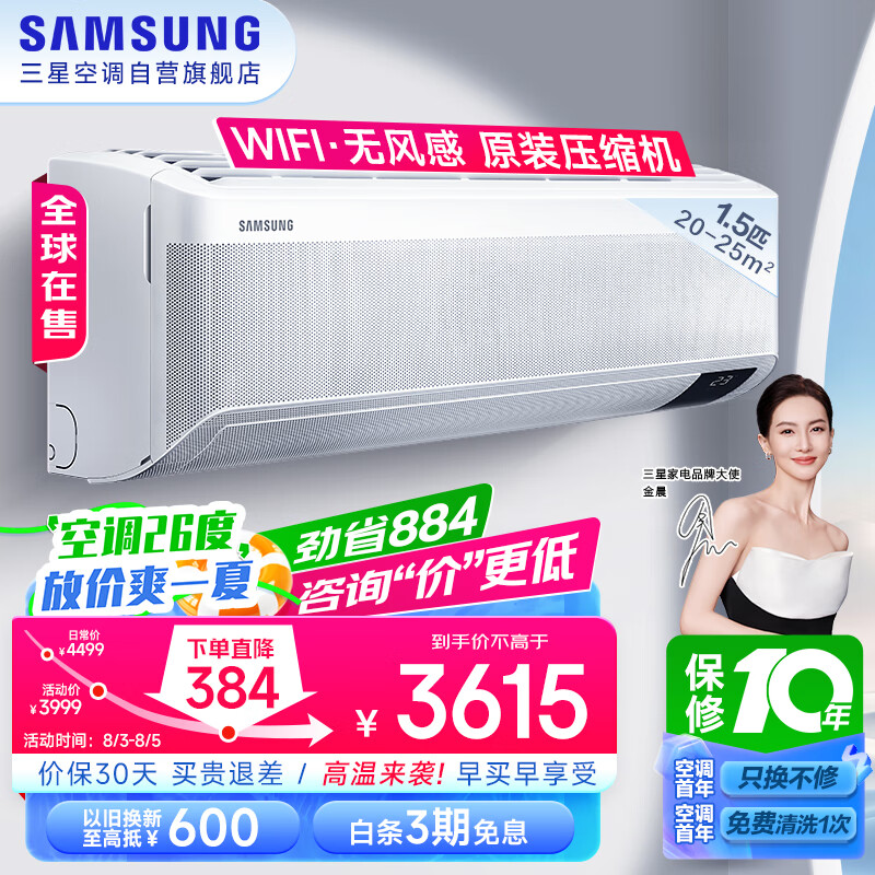 三星空调1.5匹无风感全直流变频WIFI新三级能效冷暖除湿壁挂式挂机20-25㎡适用以旧换新AR12TSFAAWKNSC价格:3699.00元!