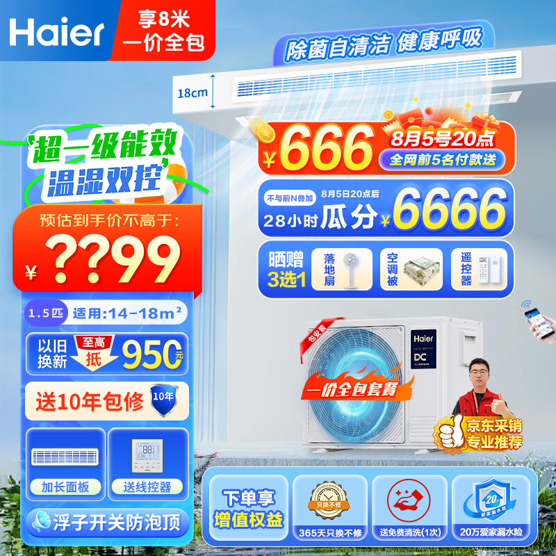 海尔(Haier)中央空调风管机一拖一 1.5匹新一级能效 卧室嵌入式空调 云舒 一价全包 KFRd-35NW/70EAD81价格:4999.00元!