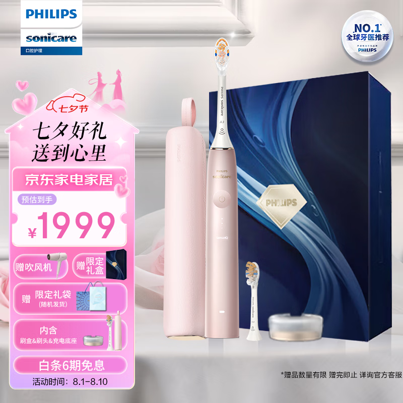飞利浦(PHILIPS)电动牙刷成人 七夕礼物送男女友 含充电旅行盒20倍清除牙菌斑智能感应钻石AI刷旗舰款茱萸粉HX9996价格:2199.00元!