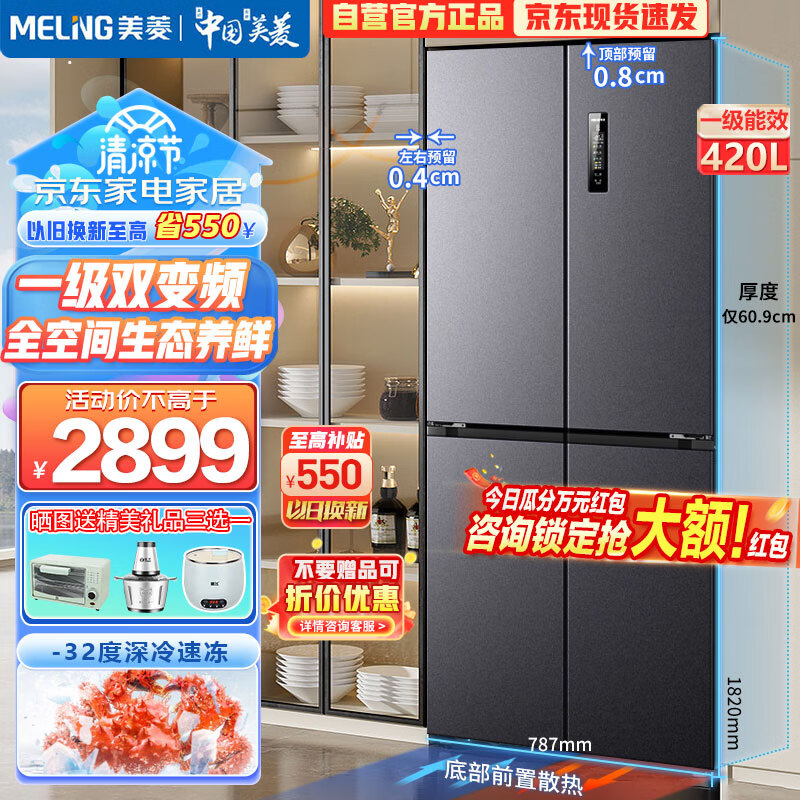 美菱(MeiLing)420升十字对开冰箱四开门多门一级双变频超薄嵌入式风冷家用底部散热电冰箱 BCD-420WP9CZX 神秘灰价格:3094.00元!