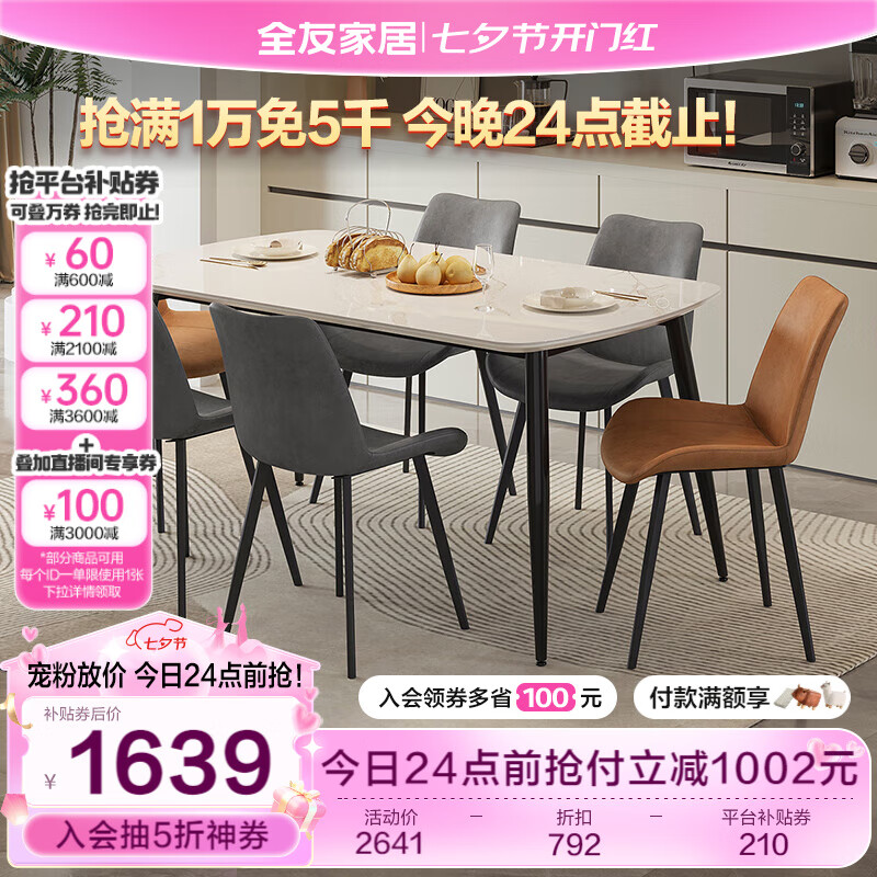 全友家居 餐桌耐用岩板台面长条桌餐厅稳固金属框架吃饭桌子DW1179价格:2641.43元!