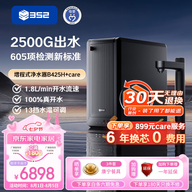 352净水器家用直饮加热一体机 2500G常温出水 400G通量6.5L/min 厨下即热饮水机B425H+care服务价格:7098.00元!