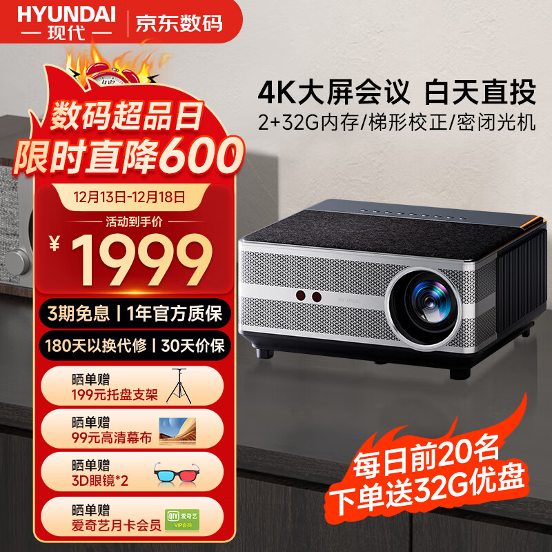 现代(HYUNDAI)H9 投影仪家用 投影机办公4K超清家庭影院(3200流明 自动对焦 自动避障/入幕 密闭式光机)价格:2599.00元!