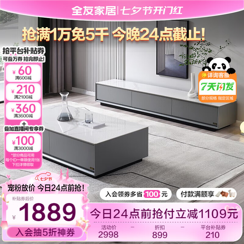 全友家居 茶几电视柜大小户型岩板茶台收纳附柜现代客厅家具DW1055价格:2998.57元!