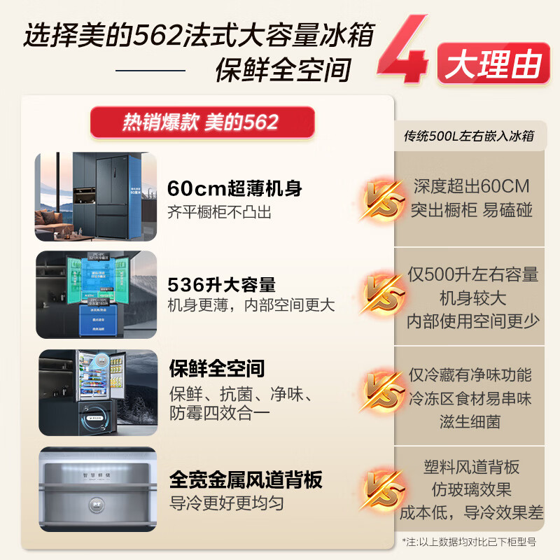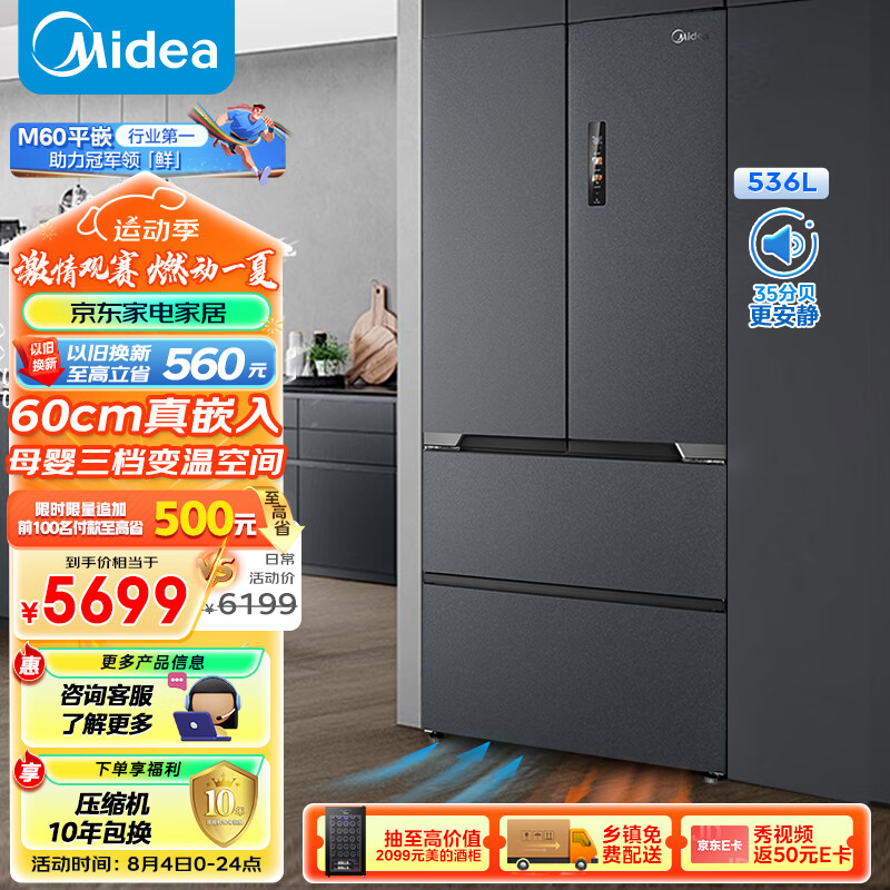 美的(Midea)M60系列562法式多门四开门超薄纯平全嵌变频风冷无霜大容量家用电冰箱智能MR-562WUFPZE底部散热价格:6499.00元!