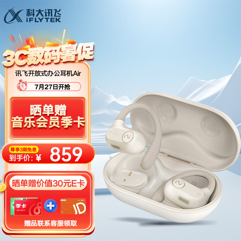 科大讯飞开放式办公耳机 Air 白 无线蓝牙耳机 骨传导升级气传导运动录音耳机 同传听译 适用苹果华为价格:859.00元!