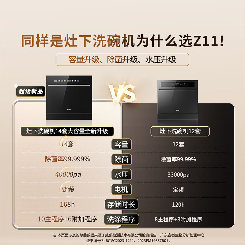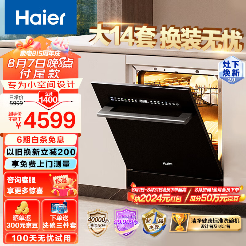 海尔(Haier)14套嵌入式灶下洗碗机焕新家Z11 双80℃消杀 一级水效变频 智能开门速干 7天存储EBW14327GHU1价格:4599.00元!