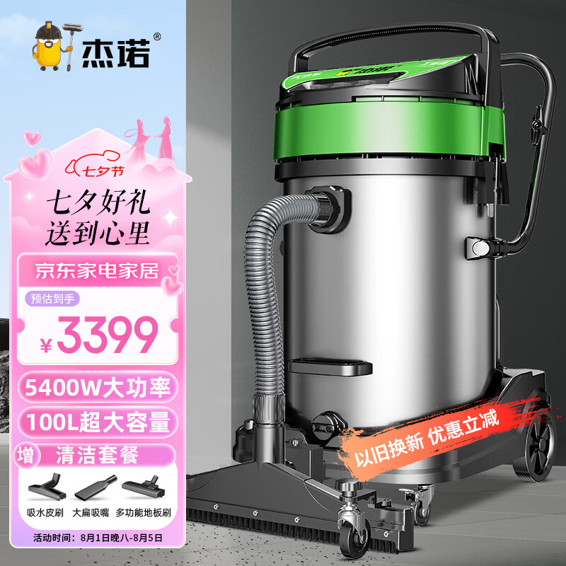 杰诺5400W大功率强大吸力干湿两用商用工业吸尘器工厂车间大型厂房粉尘吸水机JN-301T边推边吸价格:3399.00元!