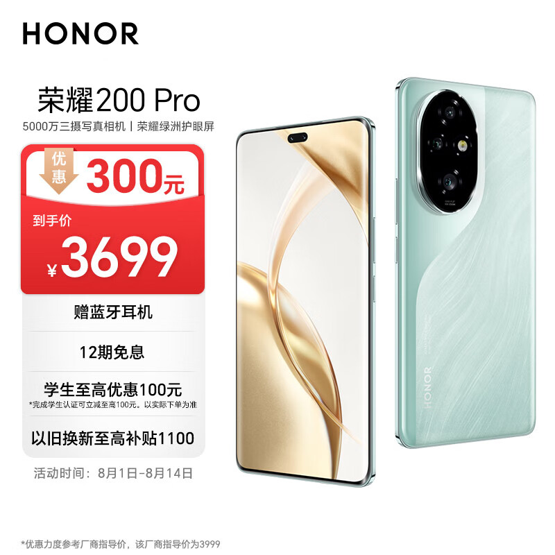 荣耀200 Pro 旗舰级青海湖电池 绿洲护眼屏 雅顾光影主摄 第三代骁龙8s 16+512 天海青 5G AI价格:3699.00元!