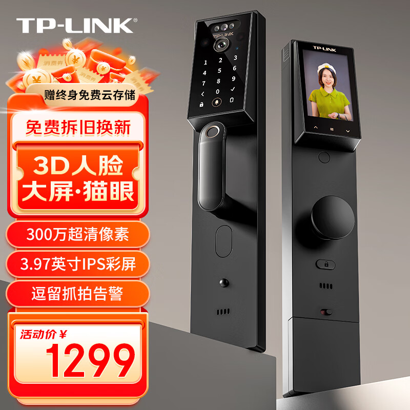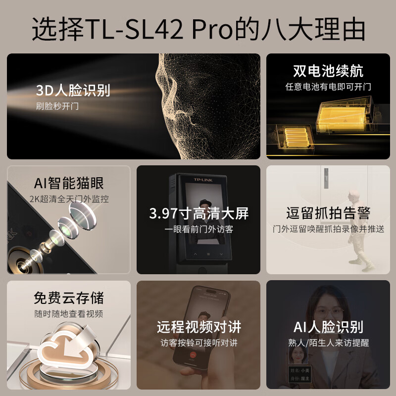TP-link 智能门锁指纹锁密码锁 3D人脸识别 可视猫眼大屏 全自动电子锁防盗门锁 NFC刷脸WiFi SL42 pro价格:1399.00元!