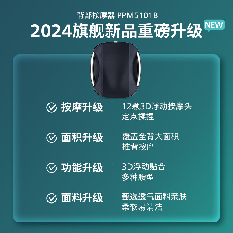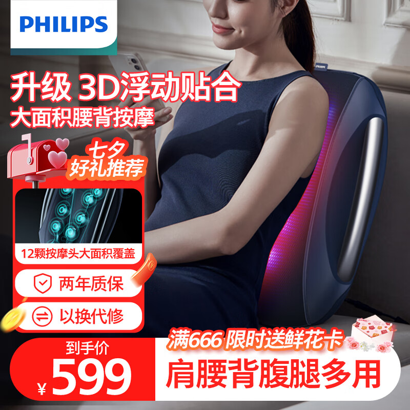 飞利浦(PHILIPS)腰部按摩器 背部按摩仪多功能腰椎揉捏热敷腰肌劳损按摩仪靠垫靠枕情人节七夕送礼礼品5101B 蓝色价格:729.00元!