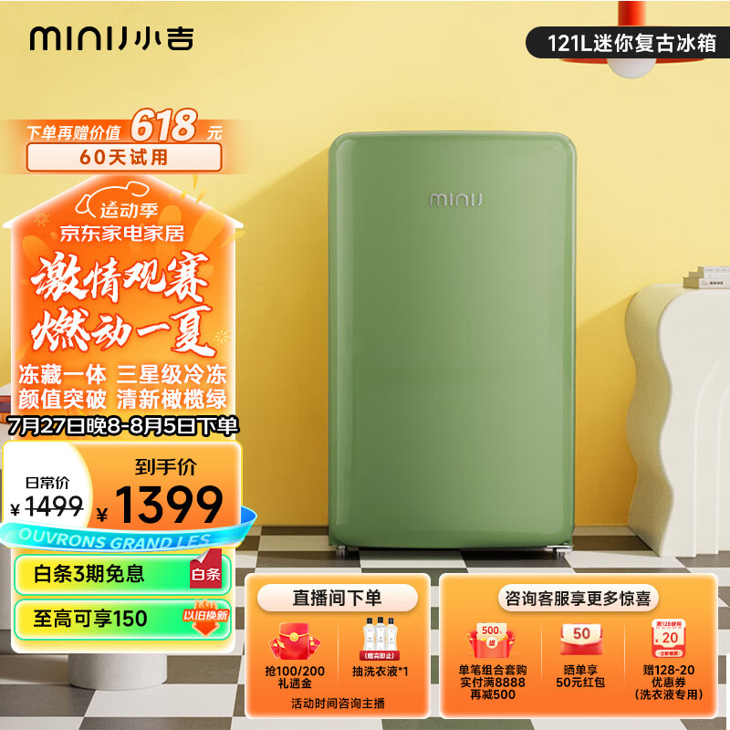 小吉(MINIJ)迷你复古小冰箱冷冻冷藏一体小型家用租房宿舍办公室客厅冰箱礼物节能低噪BC-M121CG价格:1399.00元!