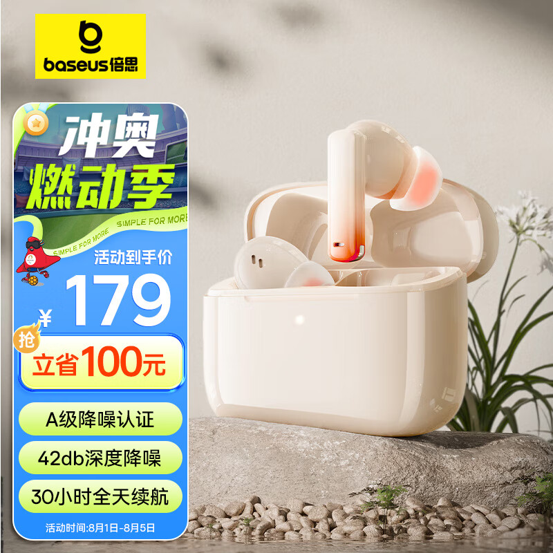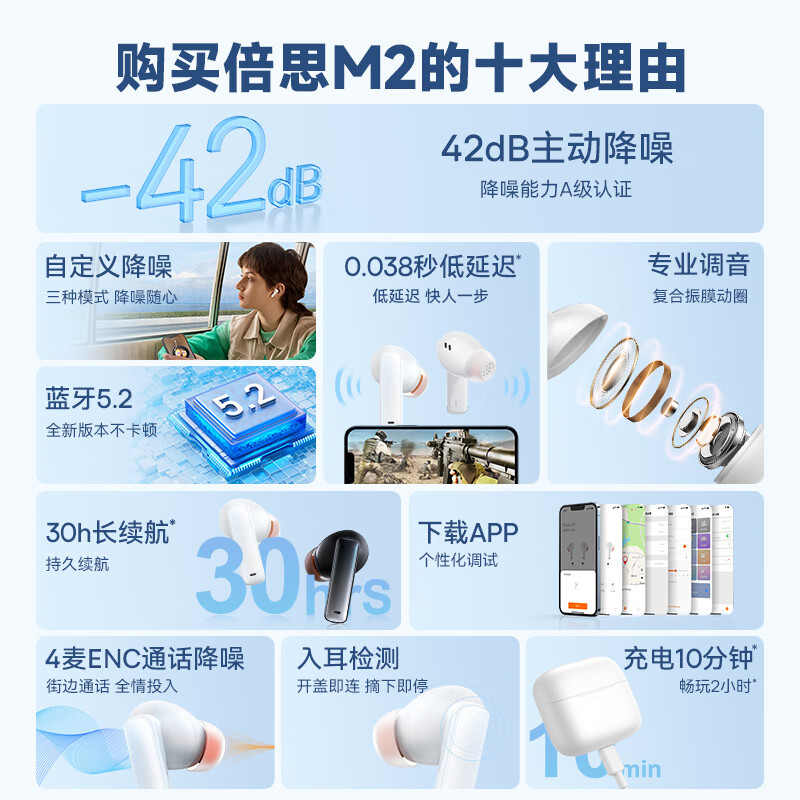 倍思 M2 蓝牙耳机真无线入耳式主动降噪游戏通话低延迟长续航通用苹果华为oppo小米手机 米白色价格:179.00元!