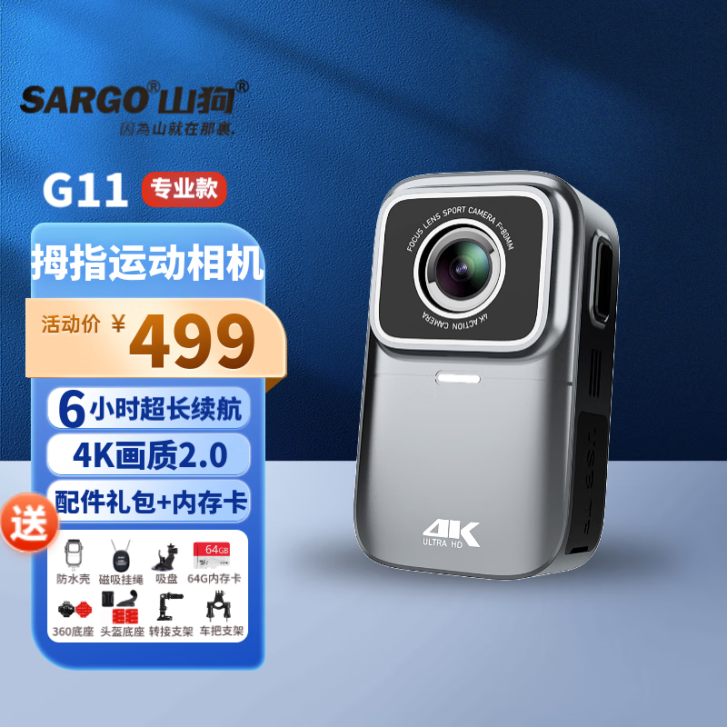 山狗G11 拇指运动相机 4K高清防抖摩托车行车记录仪非360全景相机自行车头盔骑行vlog神器小型摄像机价格:499.00元!