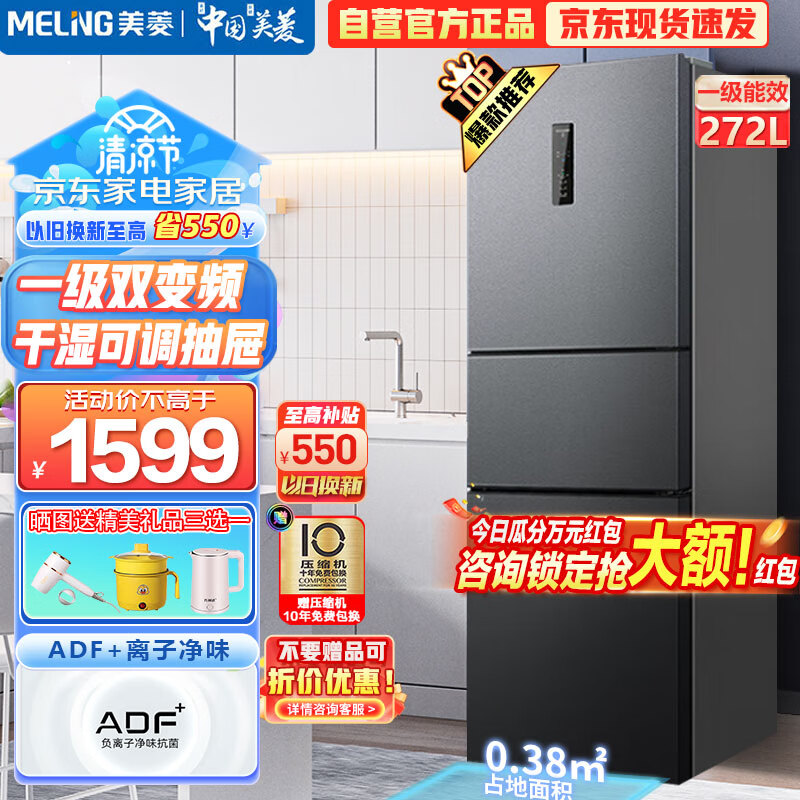 美菱(MeiLing)【离子净】272升三门家用冰箱三开门多门双变频一级能效风冷无霜 租房宿舍小冰箱BCD-272WP3CX价格:1599.00元!