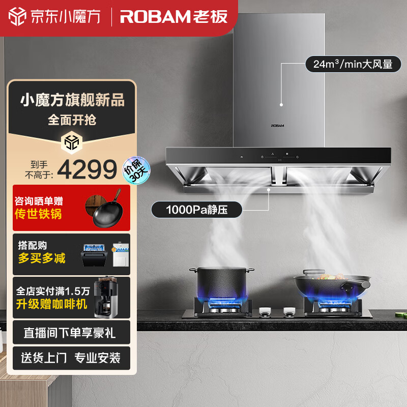 老板(Robam)抽油烟机D3S欧式顶吸双腔变频24大风量家用燃气灶吸油烟机灶具套装60D3S+30B6D套装(天然气)价格:4299.00元!