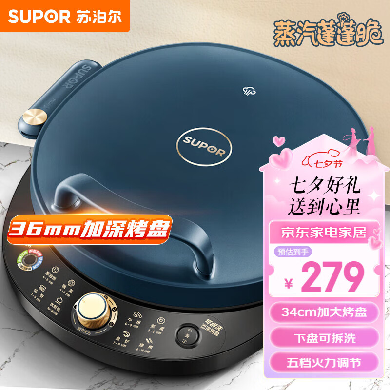 苏泊尔(SUPOR)电饼铛家用电饼档双面加热 可拆洗三明治机早餐机煎饼锅 加深加大多功能烙饼锅JD34RQ877价格:279.00元!