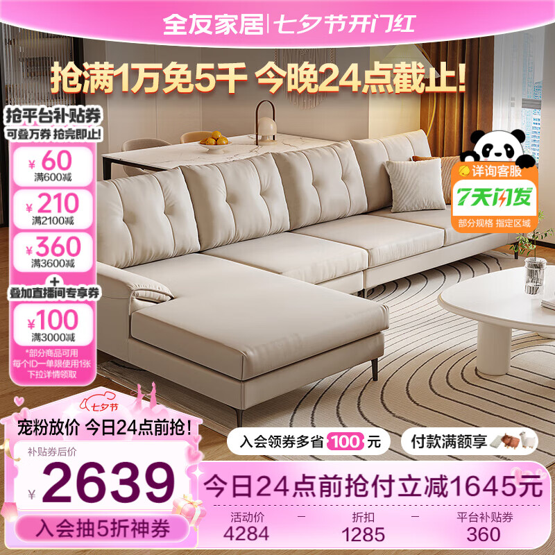 全友家居 科技布沙发客厅现代简约奶油风贵妃位布艺沙发家用111037价格:4284.29元!