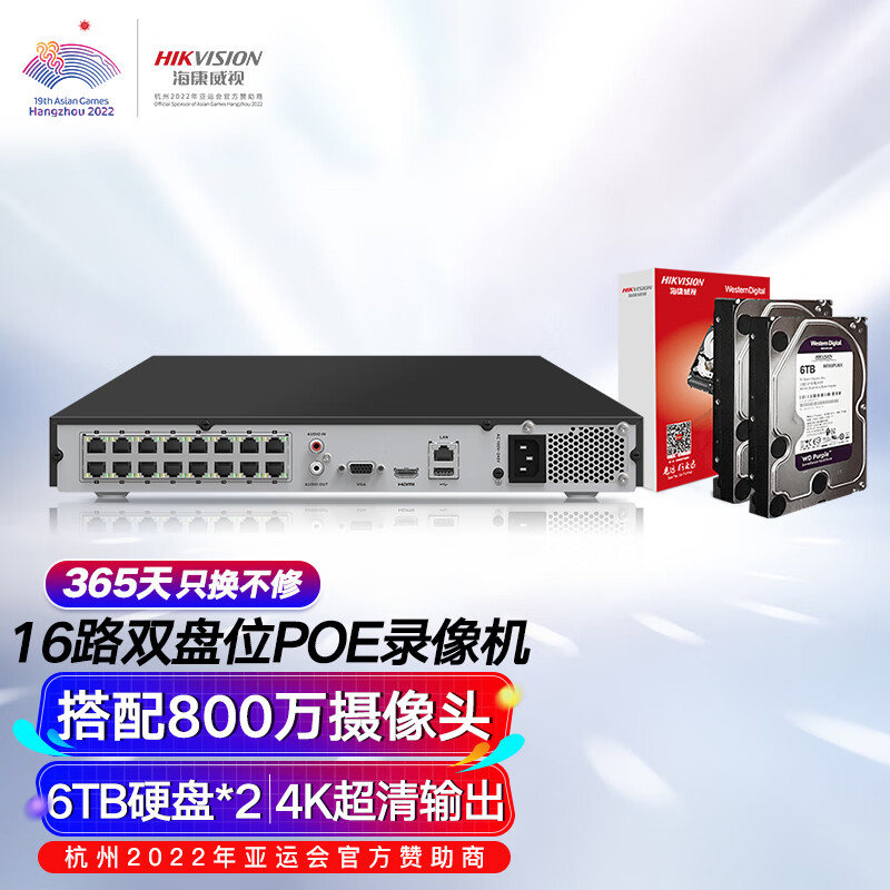 HIKVISION海康威视网络硬盘录像机监控16路POE网线供电满配16个摄像头带6T硬盘DS-7816N-R2/16P价格:4492.00元!