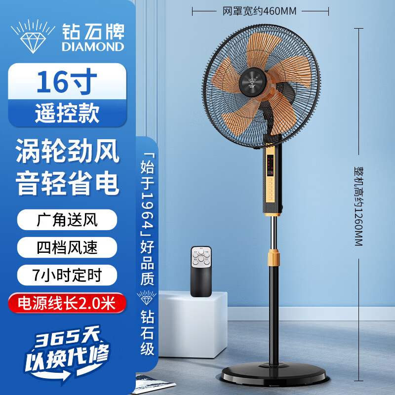钻石牌(DIAMOND)电风扇家用落地扇办公室立式风扇客厅大风量定时遥控机械摇头风扇 16吋五叶【遥控款】价格:199.00元!
