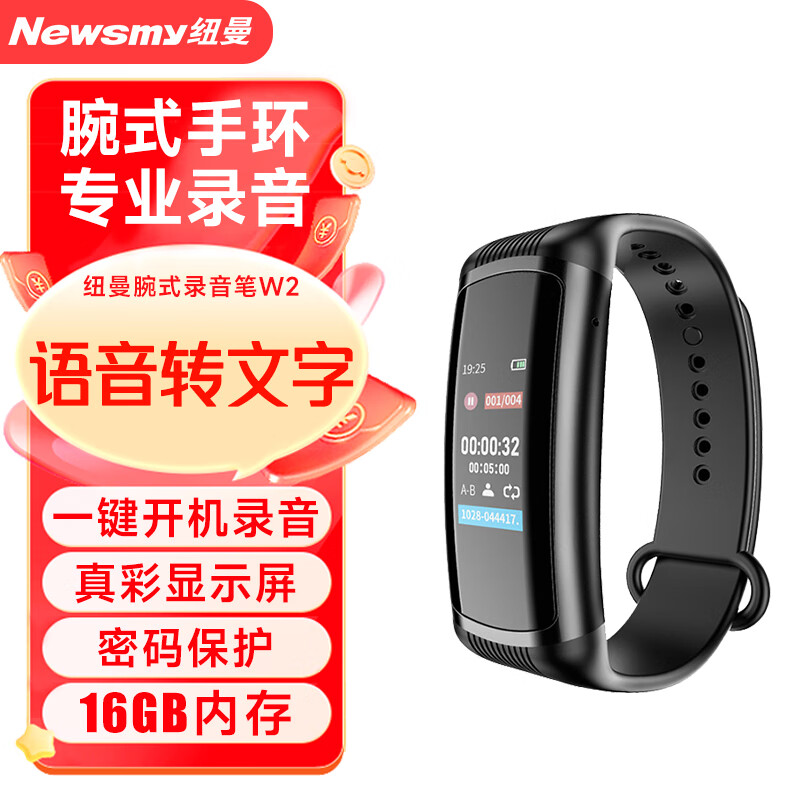 纽曼腕式录音笔 W2 16G 一键录音 高清降噪 长时录音 商务办公会议 学习培训客服 录音设备 黑色价格:179.00元!