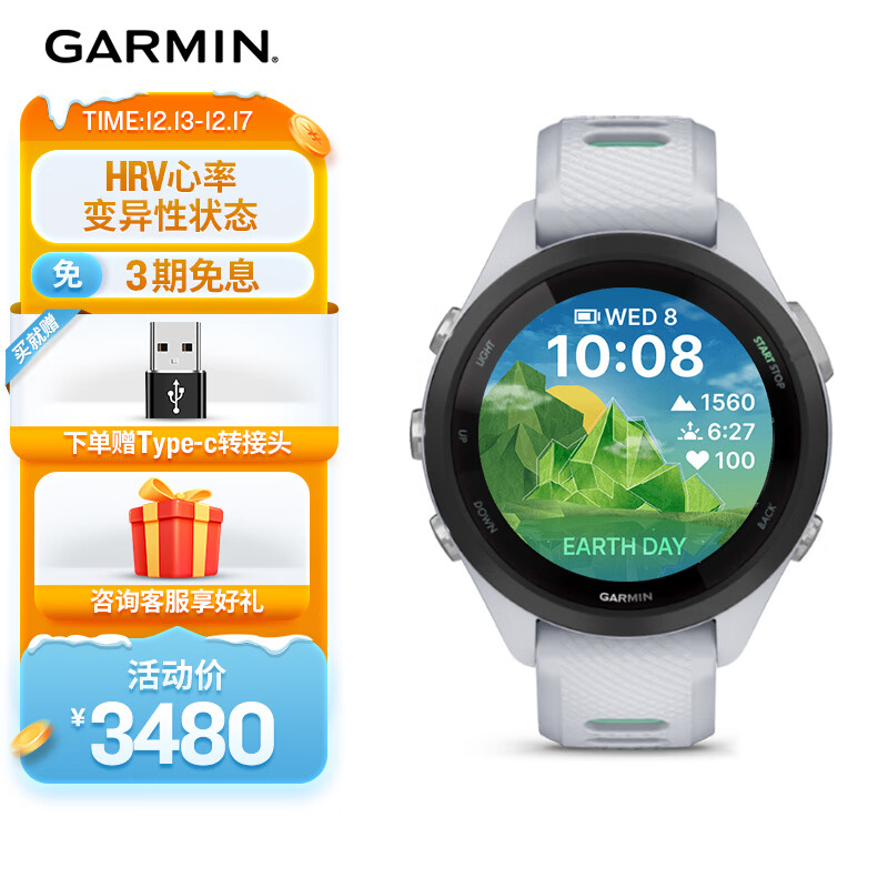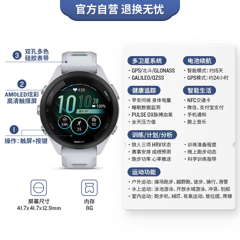 佳明(GARMIN)Forerunner265S多频多星户外智能运动手表心率血氧普拉提机月光白价格:3490.00元!