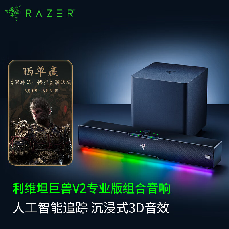 雷蛇利维坦巨兽V2专业版 条形桌面音箱 无线蓝牙音响 立体声 重低音炮 RGB幻彩 THX空间音效价格:3699.00元!