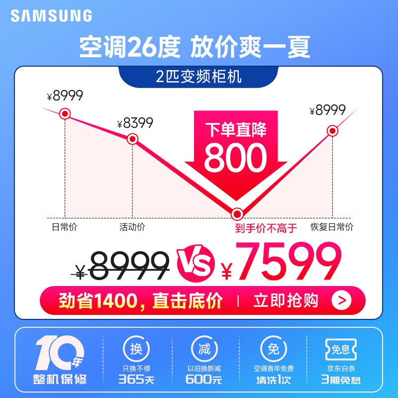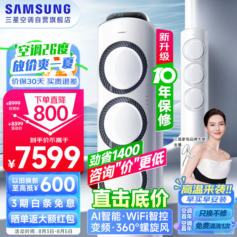 三星空调2匹新三级能效AI智能语音柜机立式全直流变频WIFI冷暖空调 26-36㎡适用以旧换新KFR-50L/EMG3价格:7599.00元!