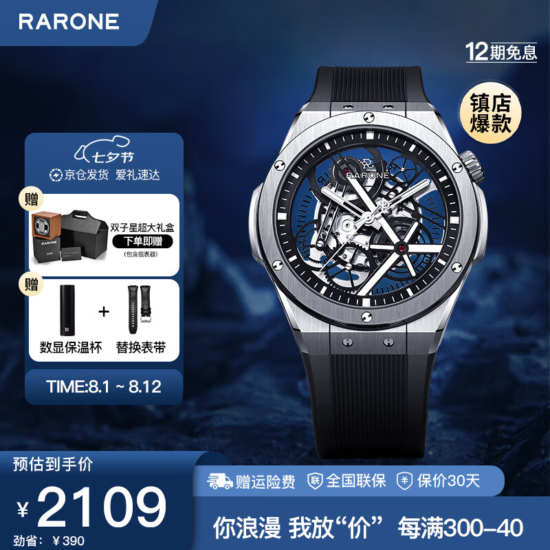 雷诺(RARONE)双子星·X时轮全景镂空机械表夜光国表品牌男士腕表礼盒装价格:2389.00元!