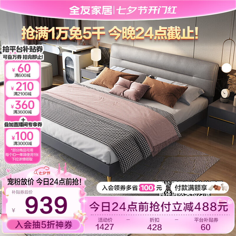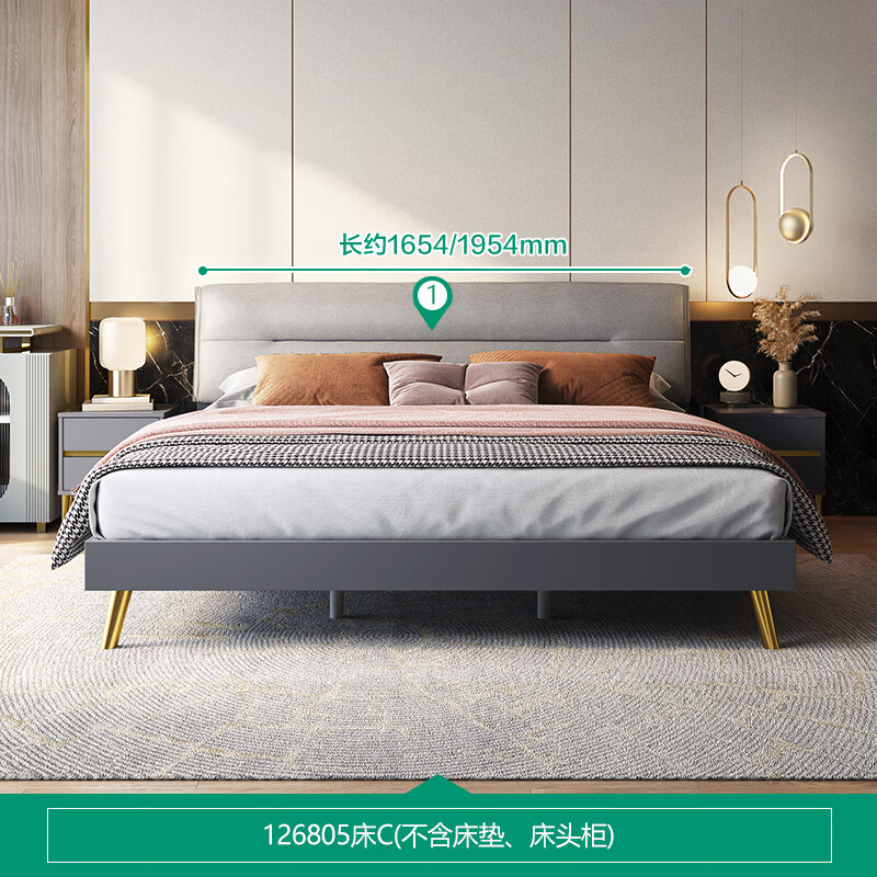 全友家居 主卧室轻奢科技布布艺板式床家用高脚双人大床1.8x2米126805价格:1427.14元!