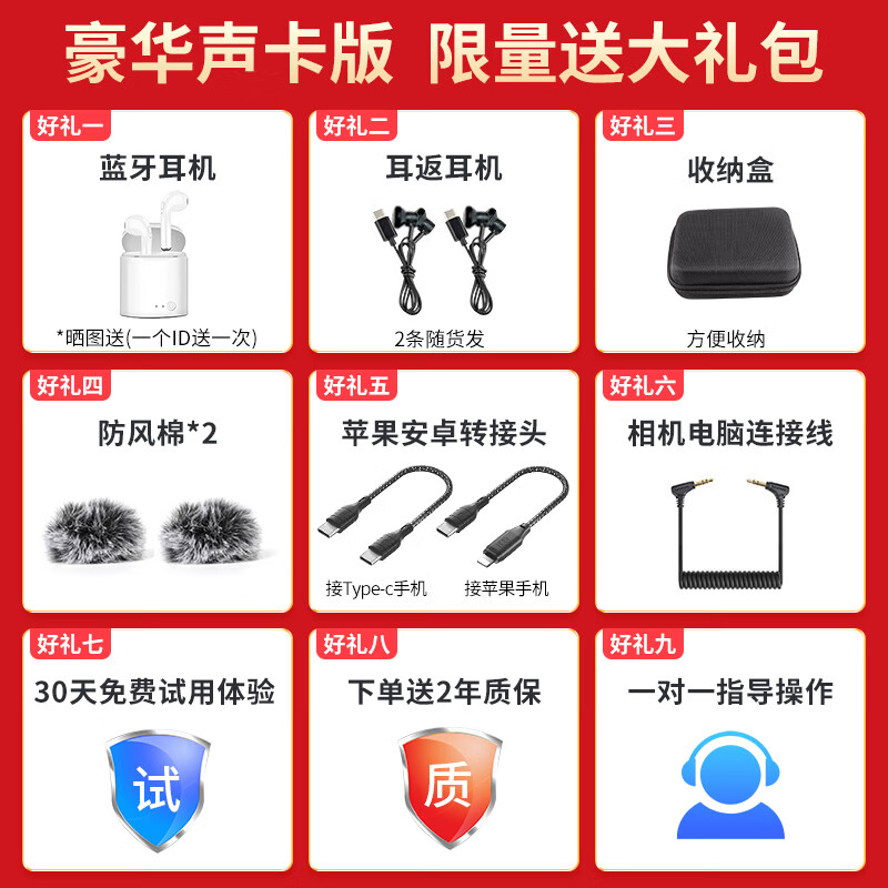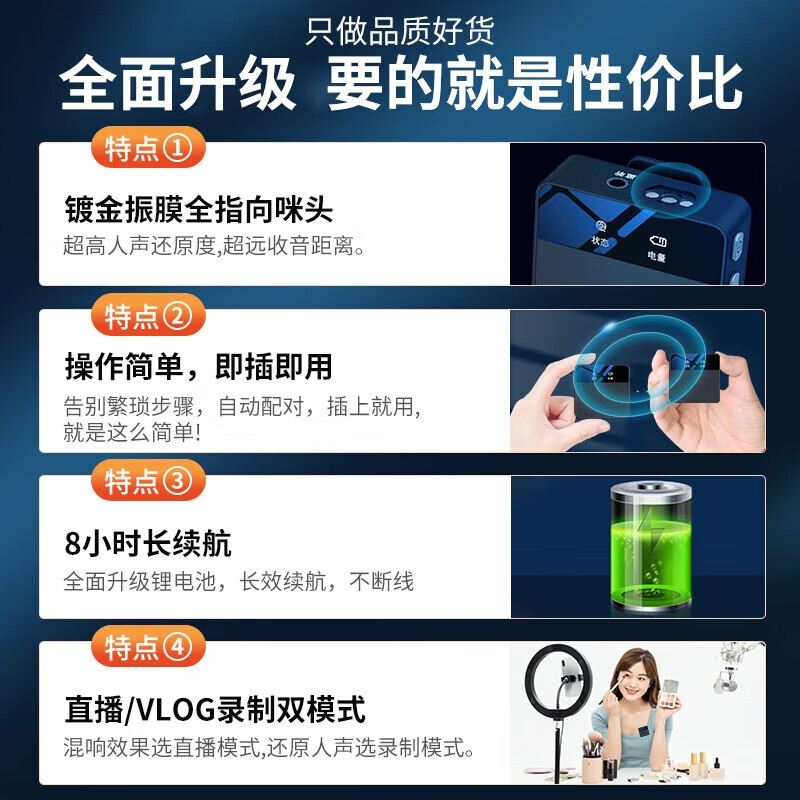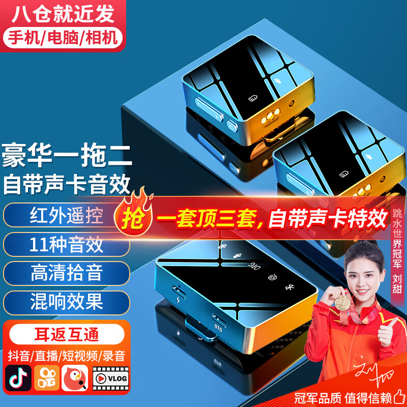 爱百分 专业无线领夹麦克风声卡收音器手机通用直播小蜜蜂户外采访降噪短视频专业vlog混响话筒拍摄录音 豪华版一拖二【声卡音效+降噪混响+蓝牙+不限设备】价格:329.00元!