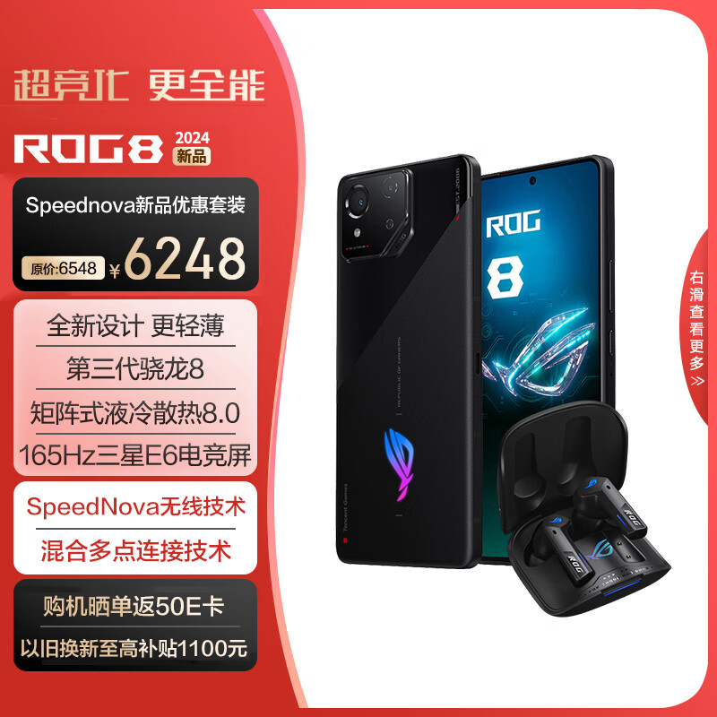 ROG8 AI游戏手机 16+256 曜石黑 骁龙8Gen3矩阵式液冷散热8.0 165Hz高刷【speednova耳机优惠组套版】价格:6248.00元!