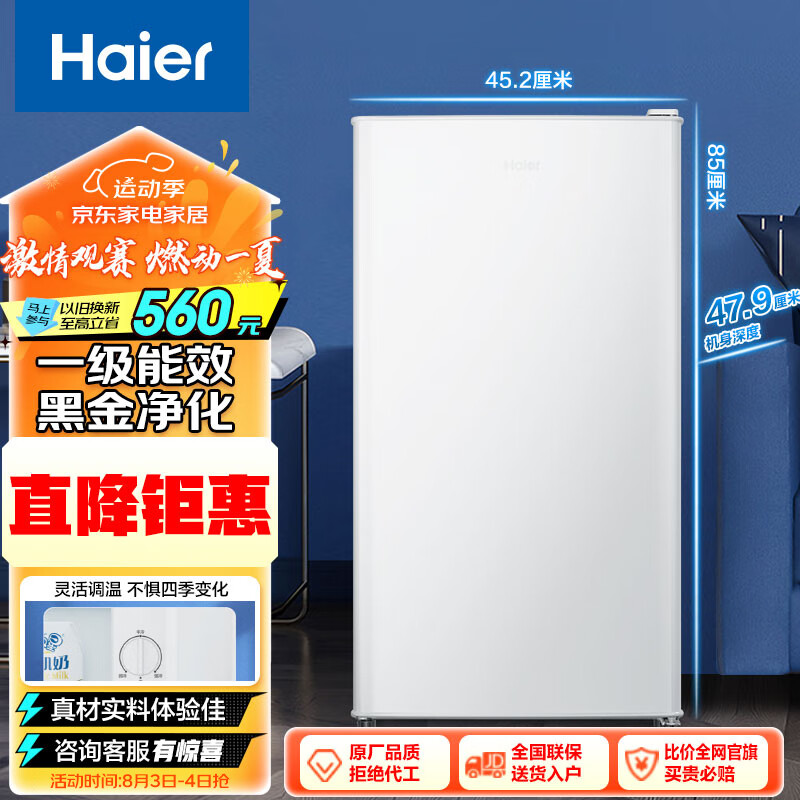 海尔(Haier)90升单门保鲜电冰箱小户型迷你家用租房宿舍办公室一级能效微型1-2人可用以旧换新1BC-90GHSDE0W9价格:649.00元!