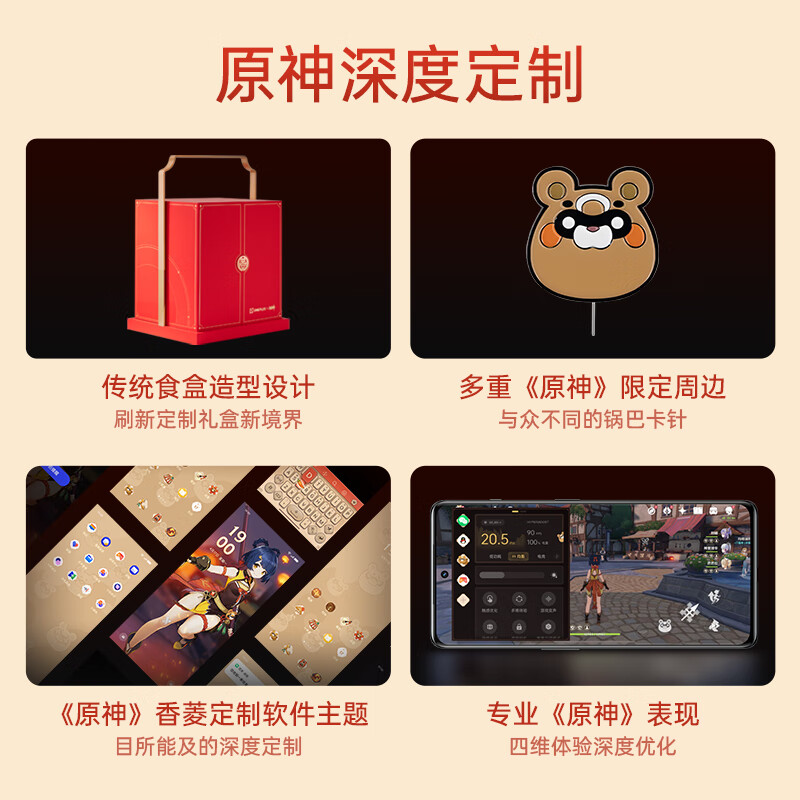 4、送来是一个大箱子,我以为是电饭煲呢,居然是手机!类似月饼大礼盒,里面有贴纸和卡片还有个可爱的锅巴挂件。仪式感很强。我是为了原神才买的,玩了一会,感觉不错,手机有点热,但是耗电没那么快,优化很好,有个专门优化的软件辅助,类似电脑上鲁大师那种监控gpu啥的辅助工具看来非常符合这部手机的定位,我很喜欢。