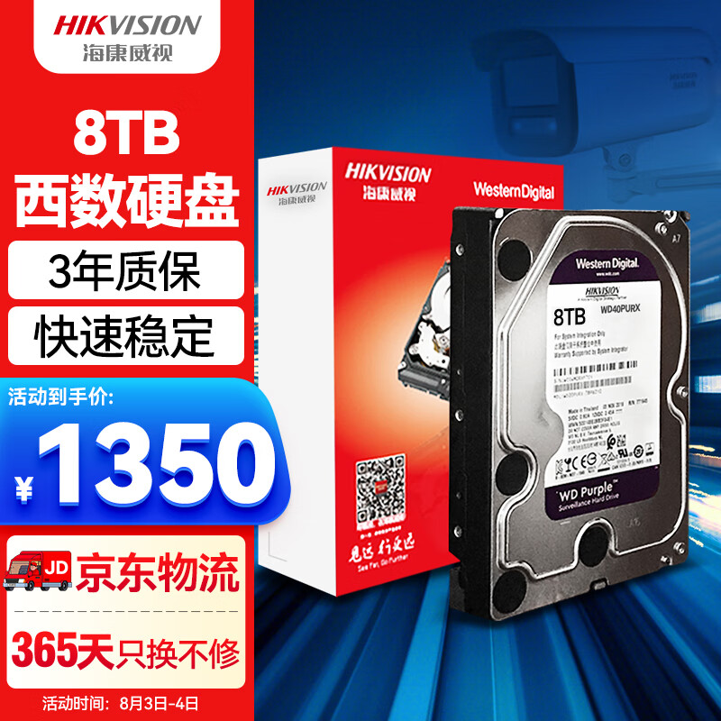 HIKVISION海康威视硬盘 西部数据 WD 监控硬盘 紫盘8TB 监控设备套装配件 录像机专用监控硬盘价格:1350.00元!