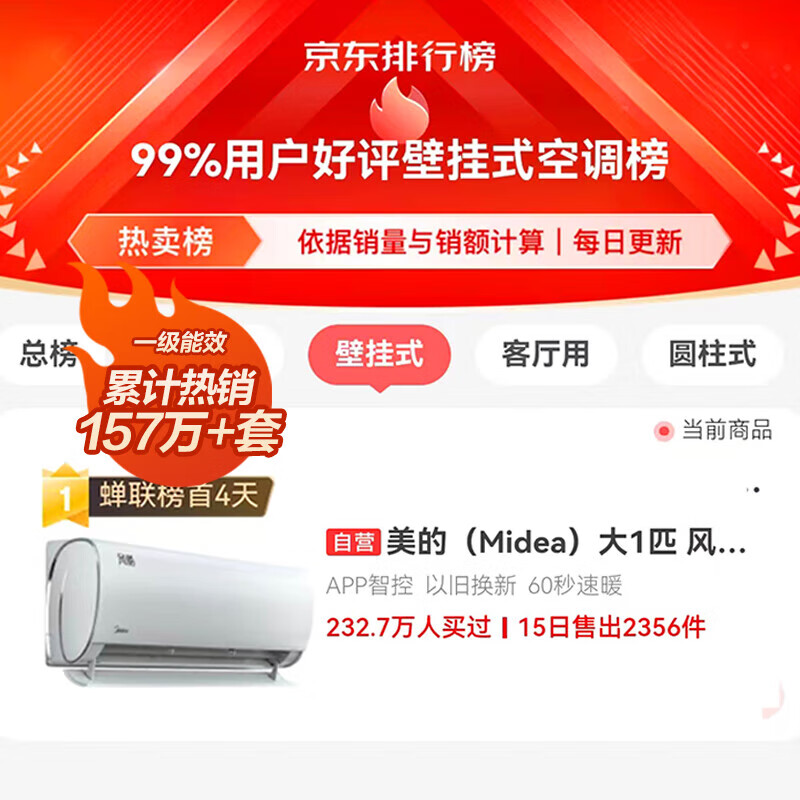 美的(Midea) 大1匹 风酷 新一级能效 变频冷暖 自清洁 壁挂式空调挂机 智能家电 KFR-26GW/N8XHC1价格:2449.00元!
