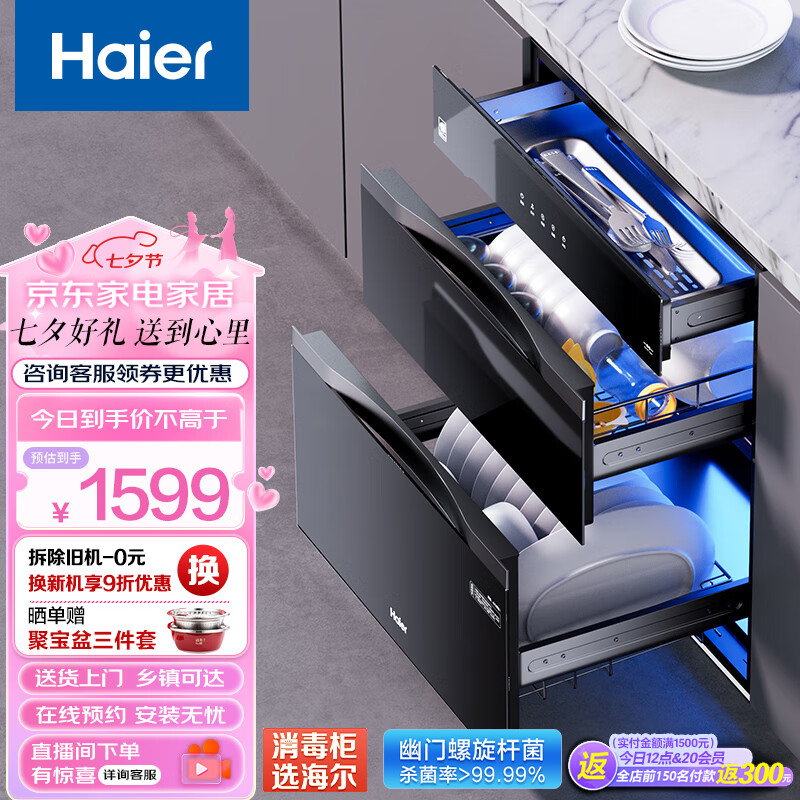 海尔(Haier)消毒柜家用 嵌入式 厨房餐具婴儿奶瓶 紫外线+光波巴氏消毒升级 110L三层分腔 童锁烘干母婴EB031价格:1599.00元!