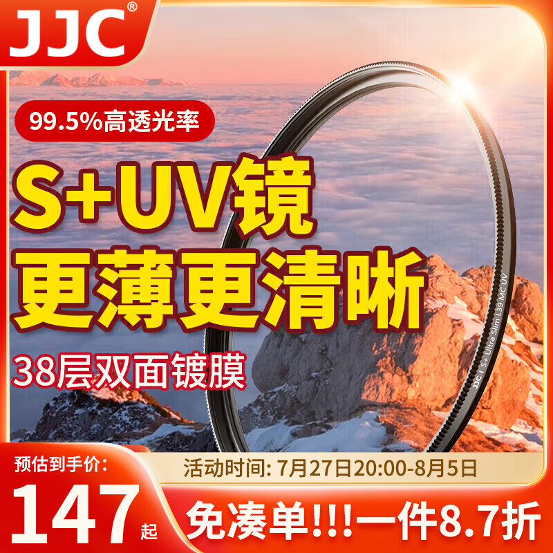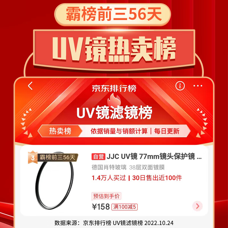 JJC UV镜 77mm镜头保护镜 S+MC双面多层镀膜无暗角 单反微单相机滤镜 适用佳能24-105尼康索尼70-200价格:168.00元!