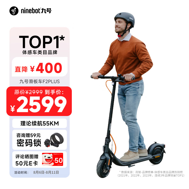 Ninebot 九号电动滑板车成人F2Plus 便携可折叠智能九号电动车自修复胎55KM长续航(支持充气宝)价格:2599.00元!