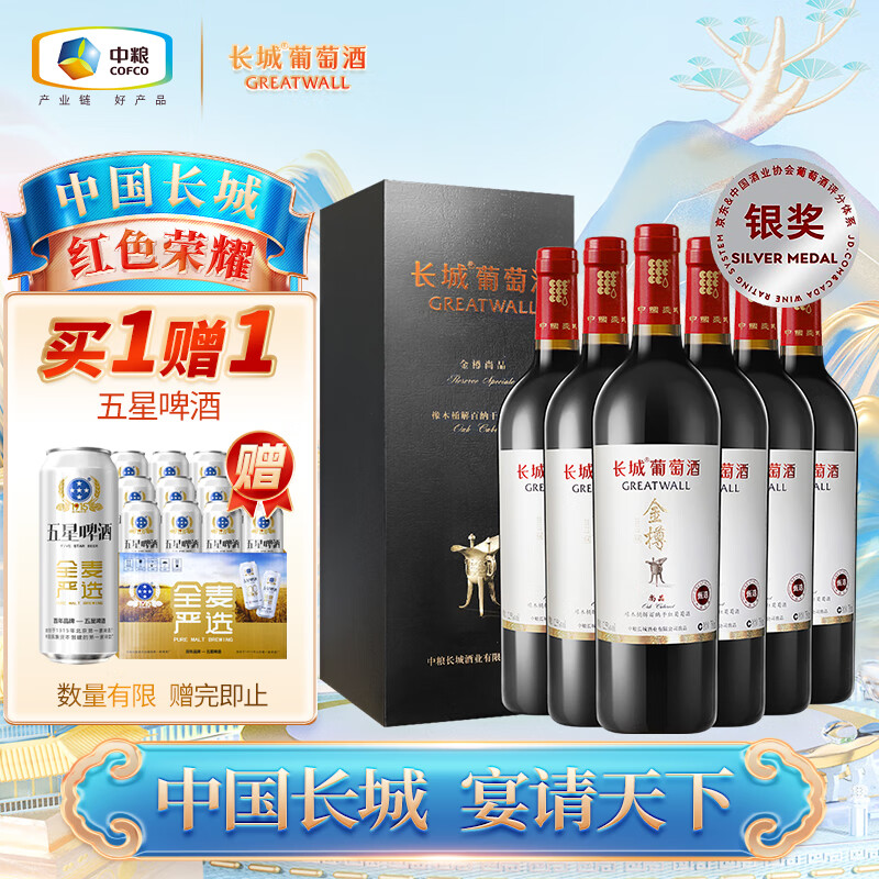 长城 金樽 尚品甄选橡木桶解百纳干红葡萄酒 礼盒 750ml*6瓶 整箱装价格:730.00元!