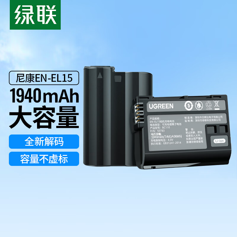 绿联(UGREEN) EN-EL15相机电池 适用尼康Z5/ZF/Z8/Z6ii/Z7ii/Nikon1V1/D810A/D800E/D7500/D7200单反数码相机价格:119.00元!