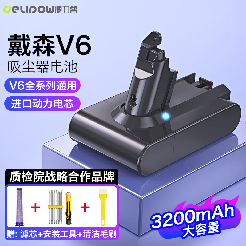 德力普(Delipow)适用戴森Dyson电池V6吸尘器充电锂电池配件 3200毫安大容量DC59/62/74/SV03/04/05/06等电池替代品价格:164.50元!