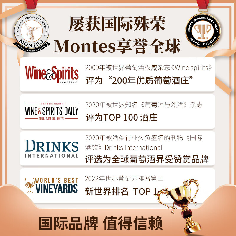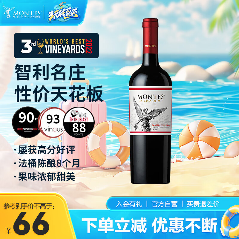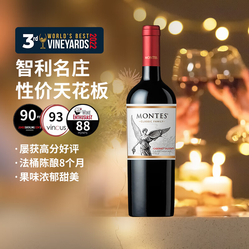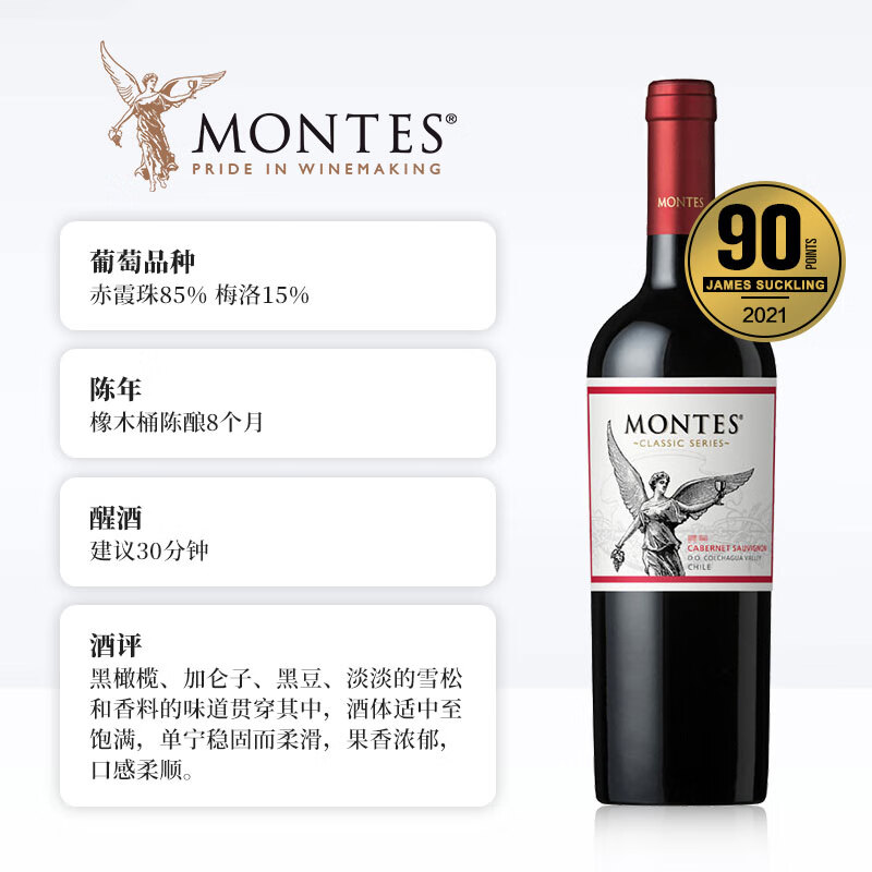MONTES蒙特斯经典赤霞珠红酒葡萄酒750ml日常口粮酒婚礼宴智利原瓶进口价格:66.00元!