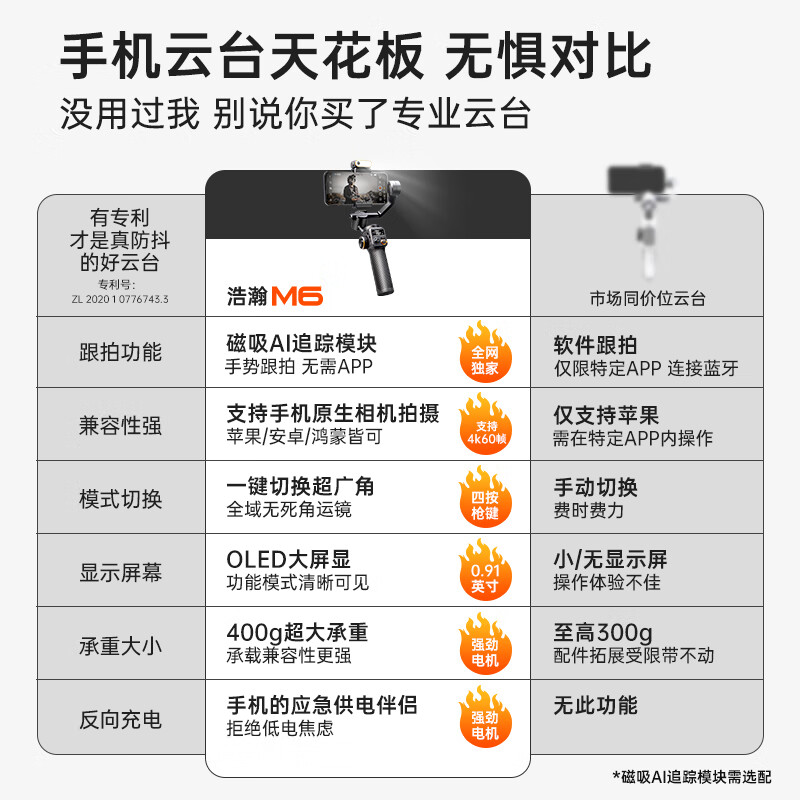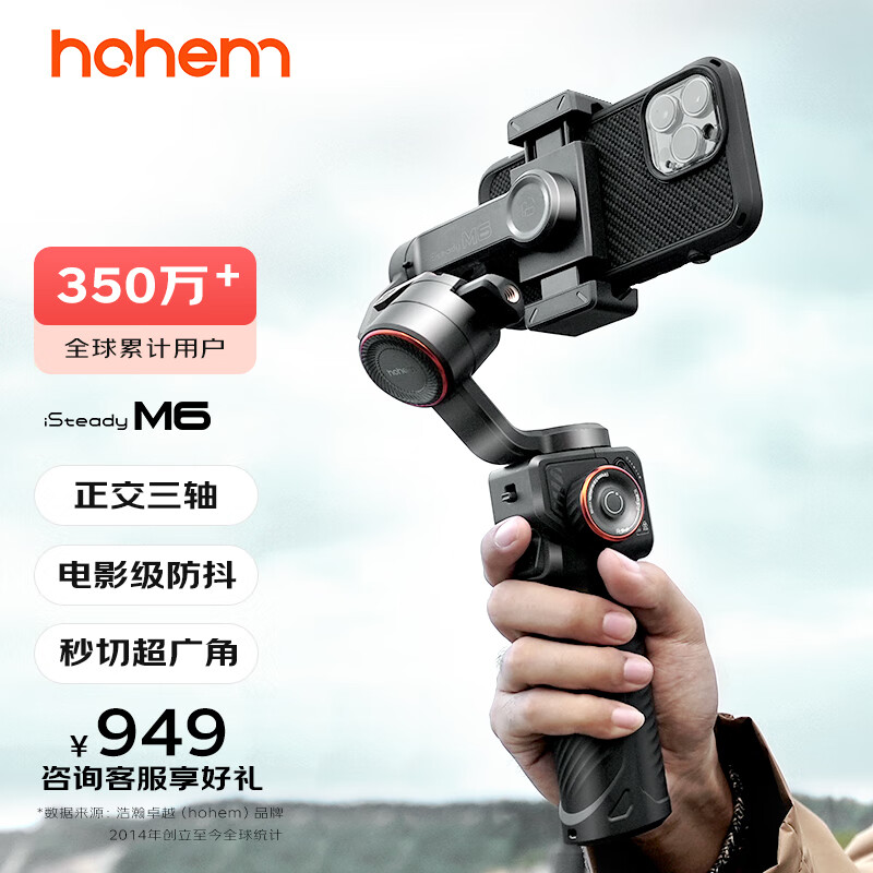 浩瀚(hohem)M6 云台 手机稳定器 手持手机云台 专业三轴防抖云台稳定器 无死角运镜 俯仰335°大角度价格:949.00元!