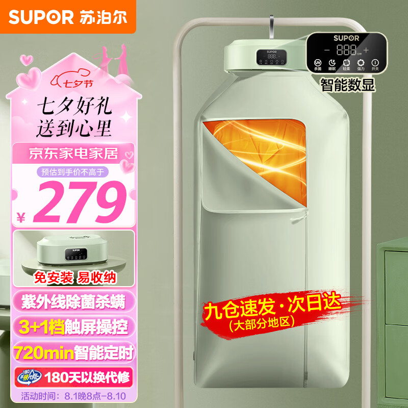 苏泊尔(SUPOR)【三档调节】烘干机家用小型婴儿烘衣服折叠便携紫外线杀菌智能720分钟定时易收纳干衣机520B价格:279.00元!