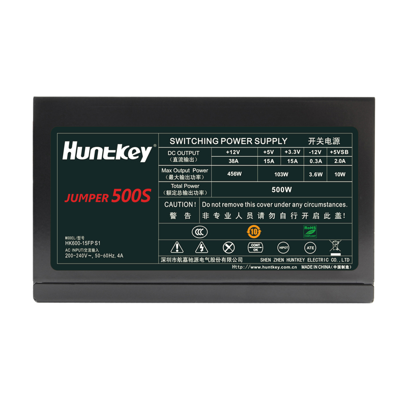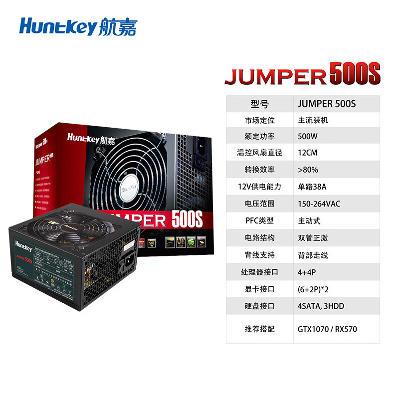 航嘉(Huntkey)JUMPER500S 额定500W 电脑电源(主动PFC/双管正激/宽幅电压/背部走线/智能温控)价格:193.00元!